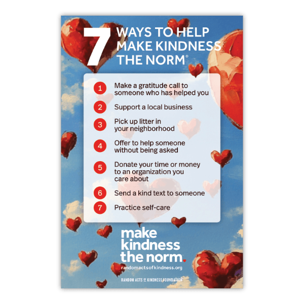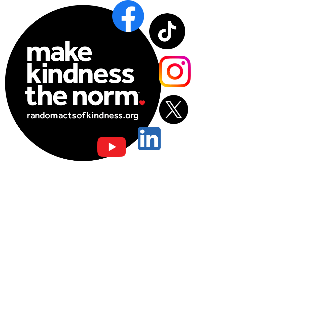 Download our premade profile & post images for Facebook, Instagram, LinkedIn, Tiktok, X / Twitter and YouTube. We also have a fun image you can post that shows 7 ways to make kindness the norm during Random Acts of Kindness Week & Random Acts of Kindness Day®.