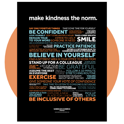 A poster showing various ways you can be kind while at work. Hang this in the break room to inspire your team!
